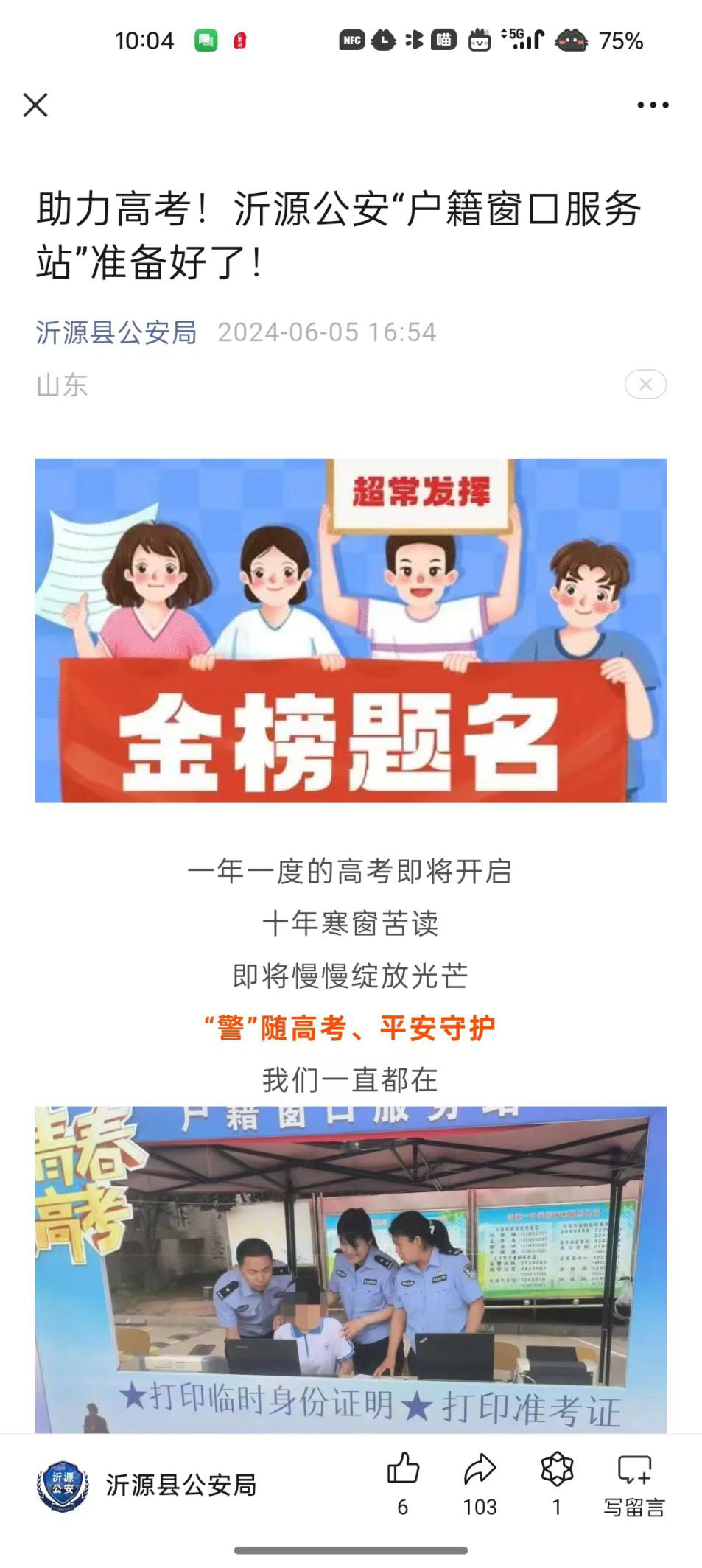 沂源县公安局以政务公开为抓手,强化部署、多措并举,积极向社会发布权威信息,助力考试安全平稳顺利,全力打造“阳光考试”“平安考试”,为莘莘学子保驾护航。 一是积极开展办证月活动。5月1日以来,全县户籍窗口开通预约办、延时办、上门办等服务举措,主动对接辖区学校,开启周末不打烊,午间不休息工作模式,通过发放“明白纸”“办证指南”及新媒体宣传等方式,提高“集中办证月”活动知晓度,全心全力为考生办理身份证件。 二是畅通在线预约服务。通过新媒体和办公场所公布等方式,向社会广泛公布户籍窗口咨询、预约电话,接受个人预约和学校集体,随时为考生办证提供最大便利。 三是集中展开宣传。在沂源一中考点显眼位置统一标准设立“户籍窗口服务站”,利用“沂源县公安局”公众号、家长微信群,提前告知广大家长和考生“户籍窗口服务站”站点设置地点、功能、联系电话等服务信息,为丢失或忘记携带身份证的考生现场办理《临时身份证明》,刷脸秒办、立等可取,并提供准考证打印、身份证挂失招领、户籍业务咨询等服务,确保考试工作的顺利开展。 | |||