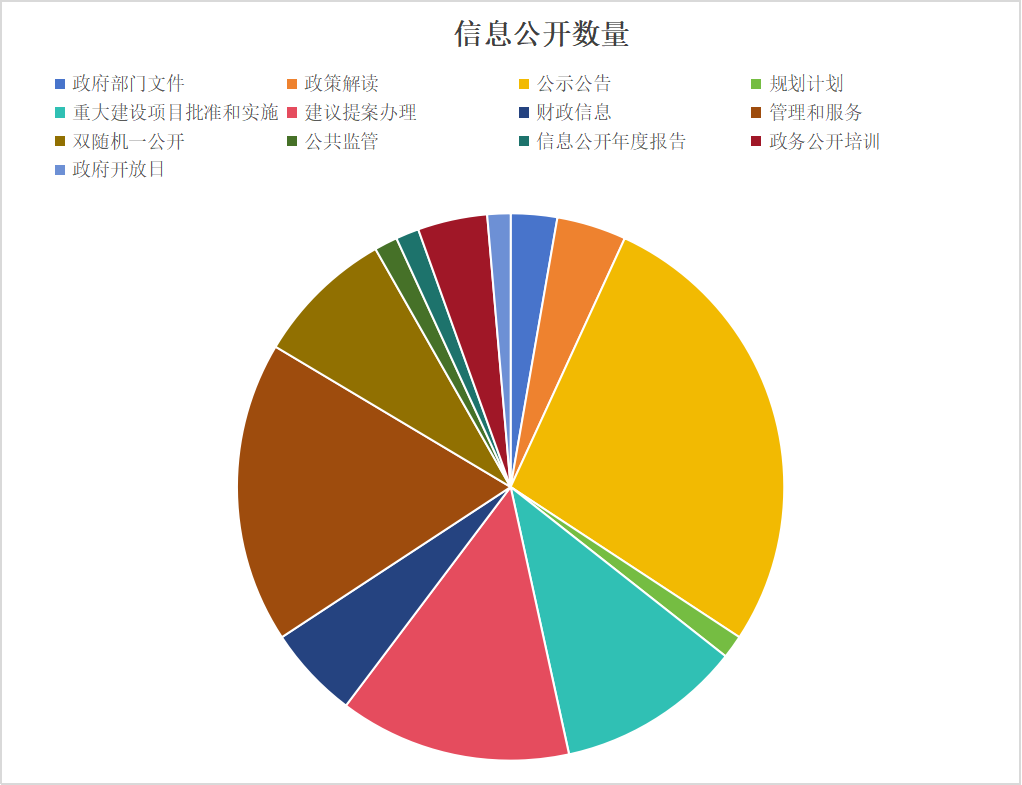 1.今年以来,主动公开政府信息73条,其中政府部门文件2条,政策解读类3条,公示公告类20条,规划计划类1条,重大建设项目批准和实施类8条,建议提案办理类10条,财政信息类4条,管理和服务公开类13条,“双随机、一公开”类6条,公共监管类1条,信息公开年度报告1条,政务公开培训3条,主动公开基本目录1条,政府开放日活动1条等。