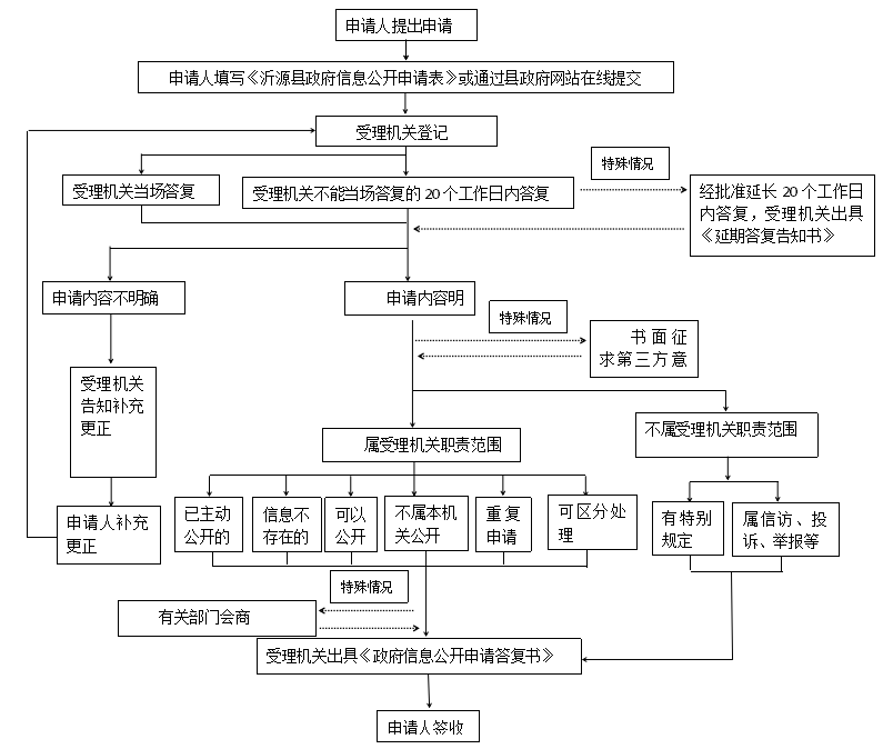 本机关办理申请人政府信息公开申请时,能够当场答复的,将当场答复;不能当场答复的,自收到申请之日起20个工作日内予以答复;确需延长答复期限的,延长答复时间不超过20个工作日,并告知申请人。政府信息涉及第三方权益的,应当征求第三方的意见,征求第三方意见所需时间不计算在期限内。