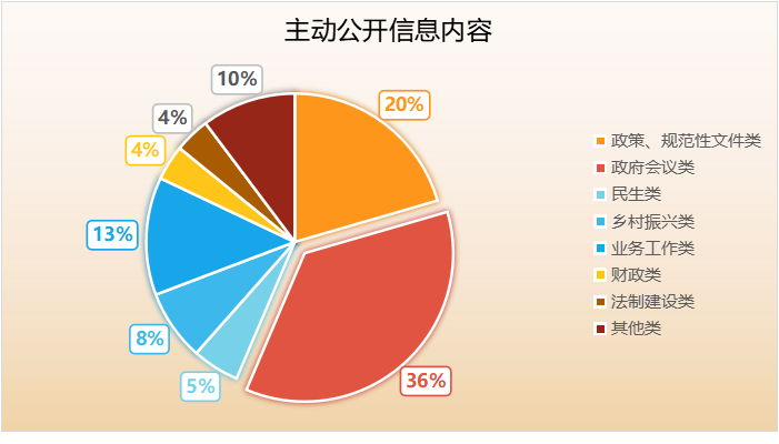 2023年,主动公开政府信息78条,其中,政策、规范性文件类信息16条,政府会议类信息28条,民生类信息4条,乡村振兴类信息6条,业务工作类信息10条,财政类信息3条,法制建设类信息3条,其他类信息8条。