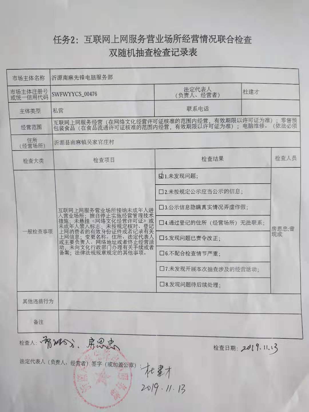 根据《企业信息公示暂行条例》、《国务院关于在市场监管领域全面推行部门联合“双随机、一公开”监管的意见》(国〔2019〕5号)、《山东省人民政府关于在市场监管领域全面推行部门联合“双随机、一公开”监管的实施意见》(鲁政发〔2019〕10号),山东省文化和旅游厅、单位现开展2019年度“双随机、一公开”检查,根据随机抽取结果,沂源县先锋网络服务部被抽为检查对象,2019年11月13日执法人员对该文化经营场所进行检查,现将检查结果公示如下: