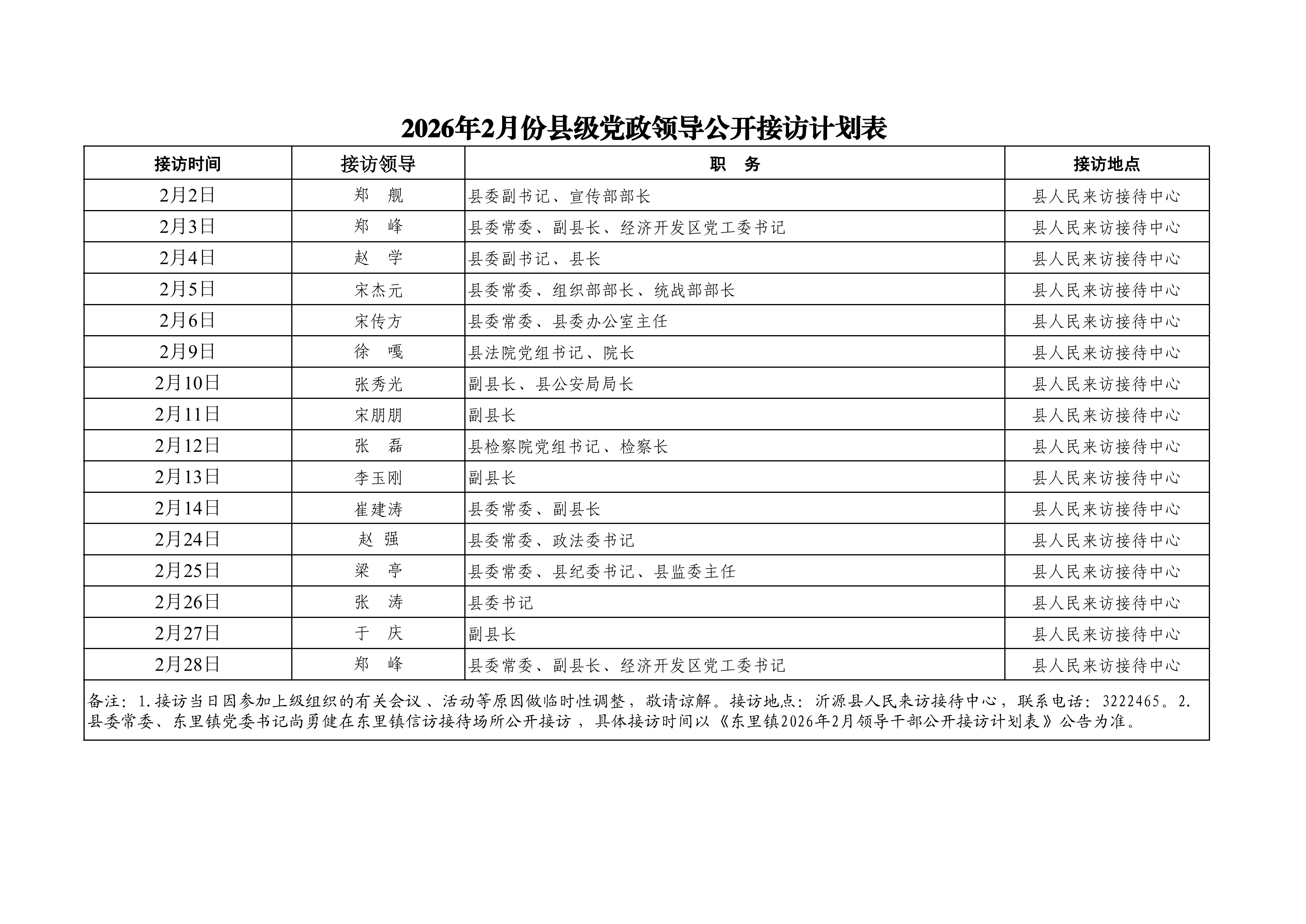 2026年2月份县级党政领导公开接访计划表
