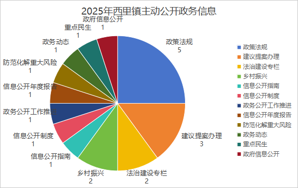 编制《沂源县西里镇人民政府主动公开事项目录》,明确主动公开事项的公开时限、公开渠道等内容。2025年,累计主动公开政府信息20条,其中,政策法规5条、建议提案办理3条、法治建设专栏 2条、乡村振兴2条、信息公开指南1条、信息公开制度1条、政务公开工作推进 1条、信息公开年度报告1条、防范化解重大风险 1条、政务动态 1条、重点民生 1条、政府信息公开1条。