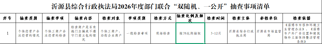 《沂源县综合行政执法局2026年度“双随机、一公开”随机抽查事项清单》