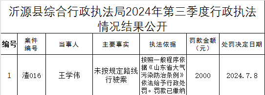 沂源县综合行政执法局2024年第三季度行政执法情况结果公开