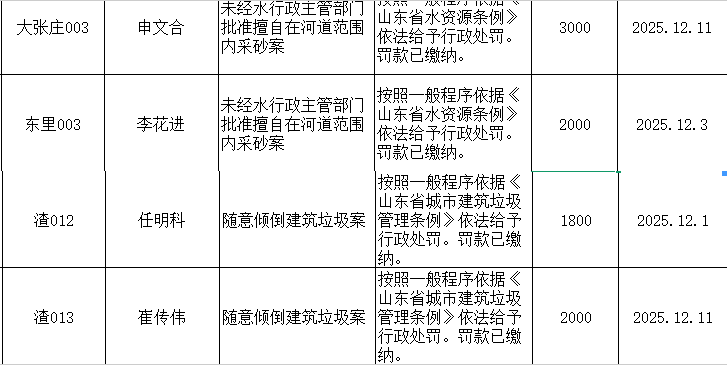 沂源县综合行政执法局2025年第四季度行政执法情况结果公开